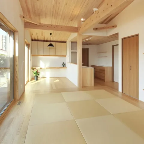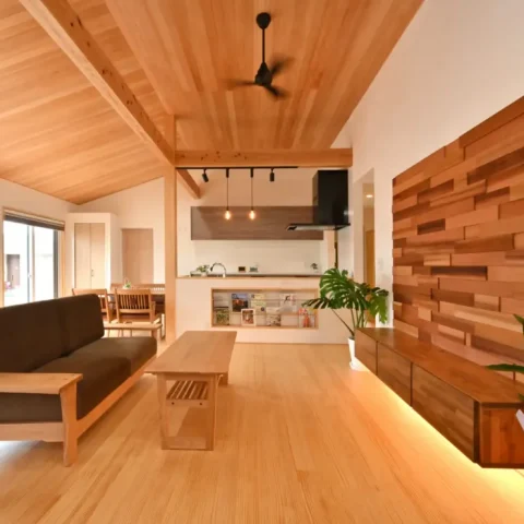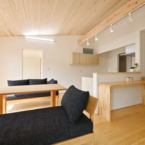 平屋の特徴を生かした勾配天井で開放的な空間にしました。照明もシンプルに、床はピノアース天井は杉の羽目板を貼り壁は漆喰塗の自然素材を使用し、健康住宅です。