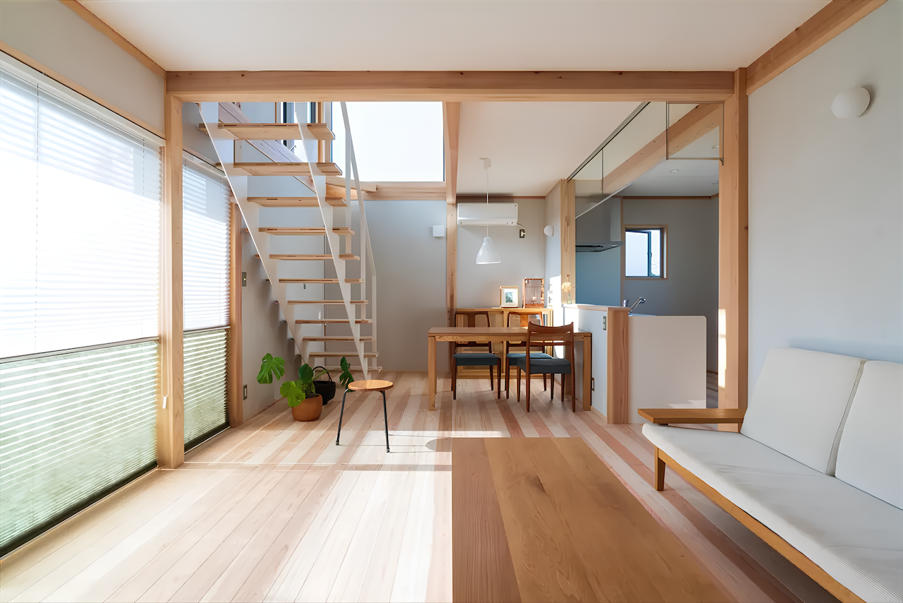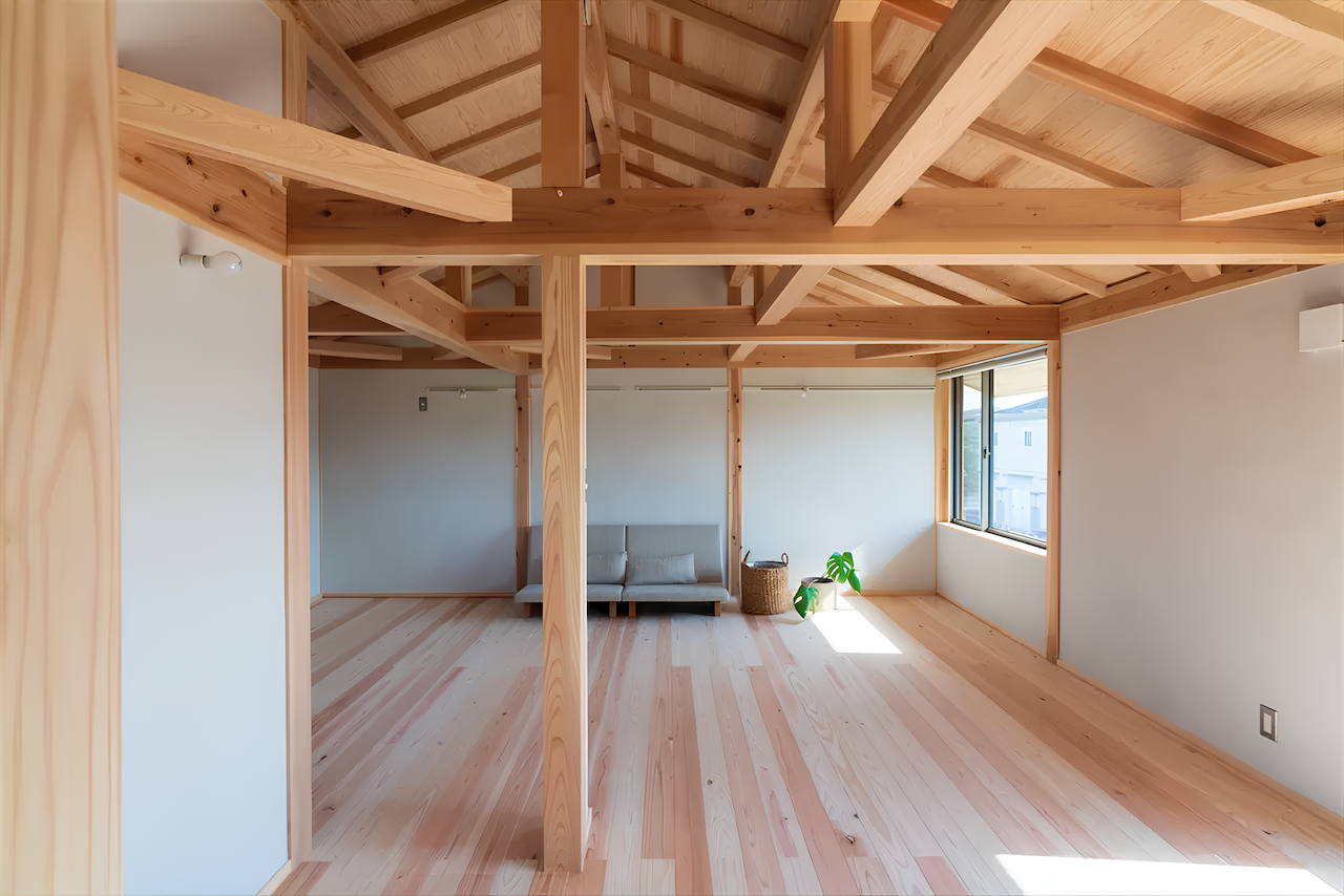 植林から自社で一貫して手がける杉や檜を使い、梁や柱などの構造を露わにし、架構や素材の美しさが感じられる家づくり。素材は自然由来のものを用い、家全体が健やかに呼吸をして清々しい空気が流れます。