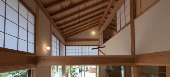 石牧建築がスタンダードとしている“登り梁架構”は木組みの美しさで高い意匠性を演出しつつ、高い強度を発揮。