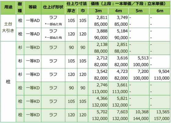 柱・平角はKD材、土台・大引には防蟻性を考慮してAD(天然乾燥)材を使用しています。