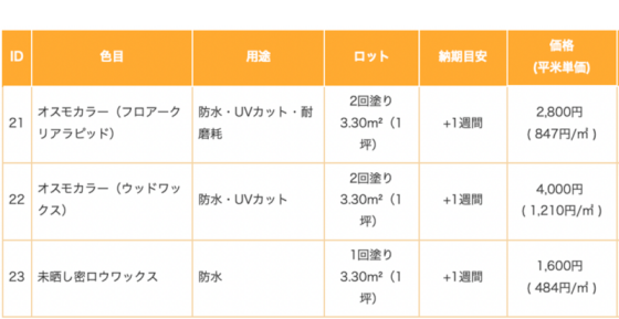 オスモカラー(植物油ベース)、未晒し蜜ロウワックス(蜜蝋ベース)など。