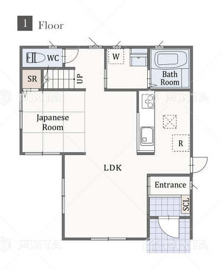 1階には、広々としたリビングルーム、ダイニングエリア、そしてモダンなキッチンが配置されており、家族や友人との交流を楽しむのに最適な空間となっています。また、1階にはゲストルームや書斎、トイレ、そして便利な収納スペースも設けられています。