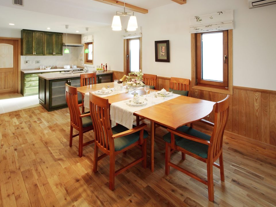 木の質感あふれる空間に、グリーンのアクセントが映えるダイニングキッチン。