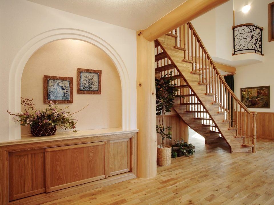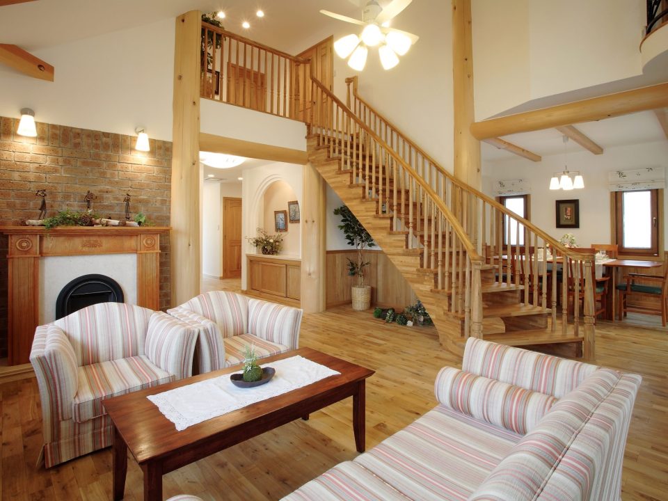 大きな吹き抜けがもたらす開放感と、無垢材の階段が印象的なリビング。