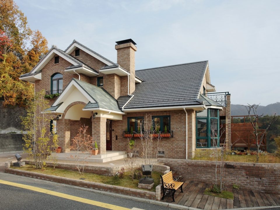 周囲の自然と美しく調和しながら、存在感を放つ煉瓦積みの外観。