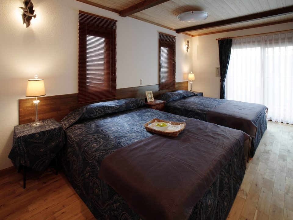 木目天井と間接照明が織りなす、温もりのあるベッドルーム。