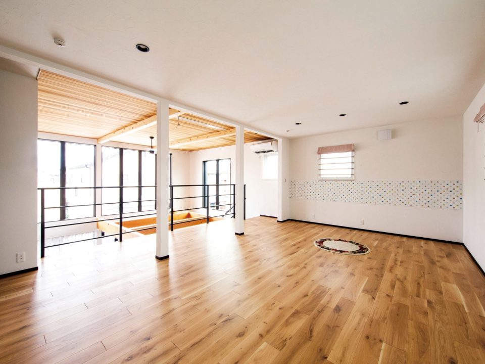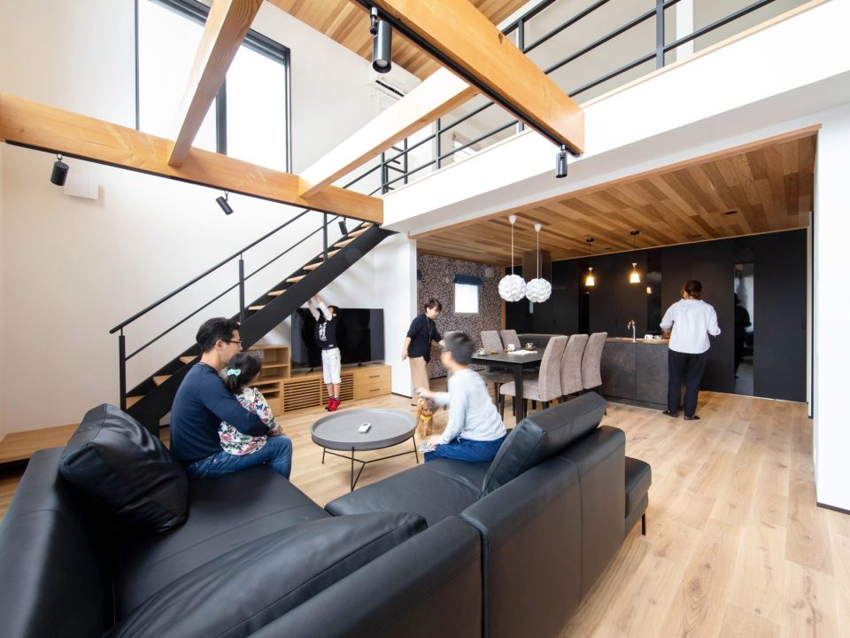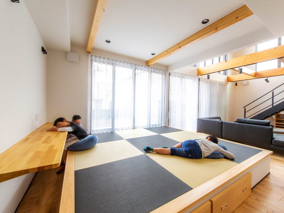 大開口と吹き抜けのLDKに、小上がりの畳スペースにカウンターデスク。