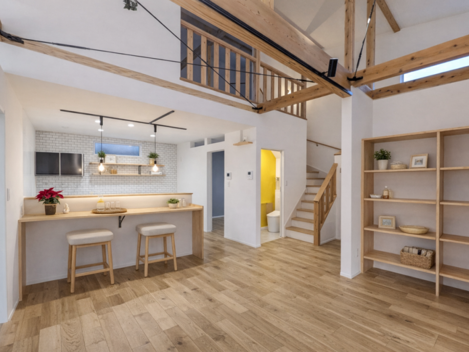 玄関〜バスルームまで伸びやかな吹き抜けが続く、開放的で広々としたLDK。