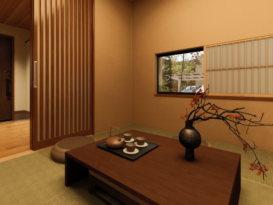 玄関から続く和室は、伝統的な意匠を大切にしながら現代の暮らしに馴染む上品な設え。
