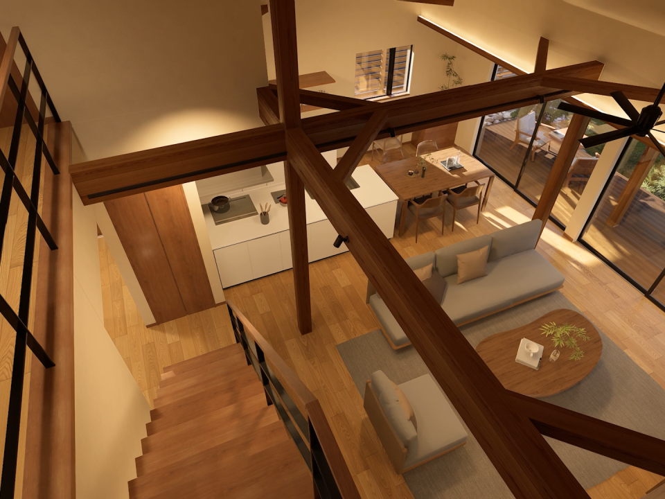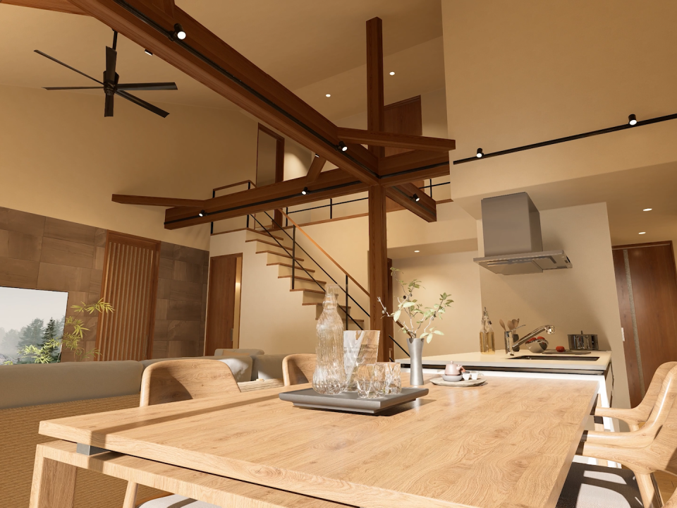 力強い梁や柱が生み出す、ダイナミックな吹き抜け空間。