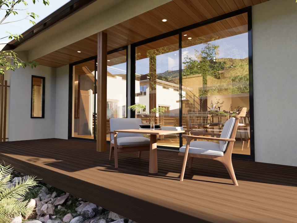 窓を開ければ、デッキスペースとひと続きになり、内と外がゆるやかに繋がる広々とした空間に。