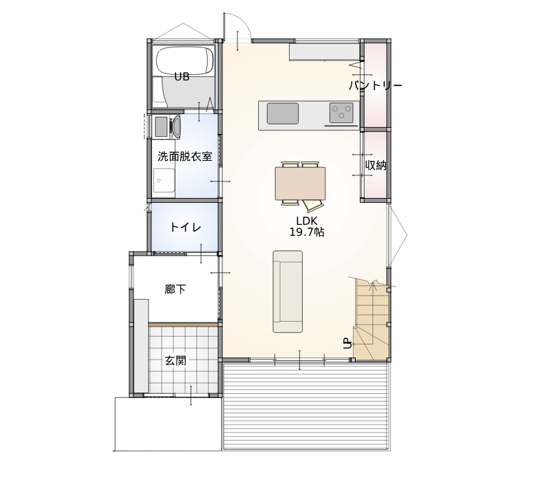 視線が奥まで一直線に伸びる設計が、LDK全体に広がりと一体感を生み出し、家族団らんの場を演出します。 -