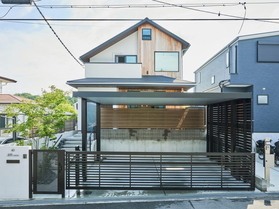 周囲の風景に溶け込む落ち着いた色合いと、木目のアクセントが調和するシンプルモダンな外観。