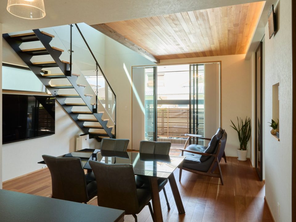 吹き抜けがもたらす開放感と、美しい木目天井が織りなす洗練された上質な空間。