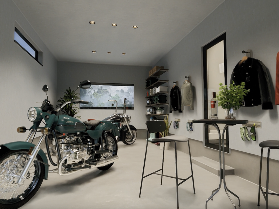 広いガレージで趣味のバイクを楽しむ