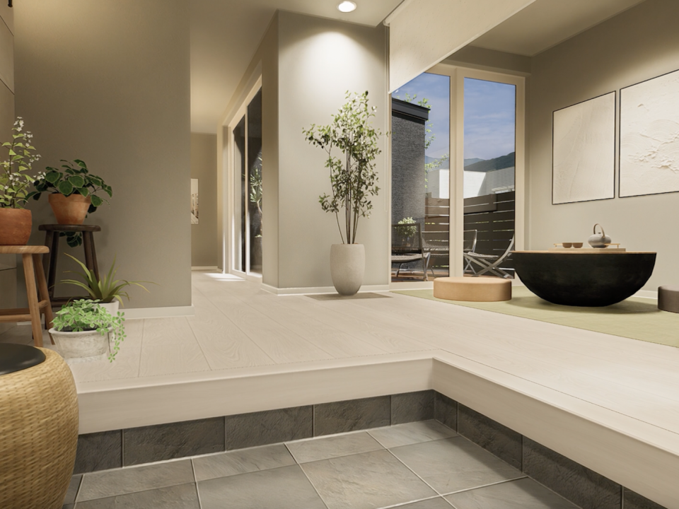 メイン玄関を開けると、来客をやさしく迎える畳コーナーが広がります。