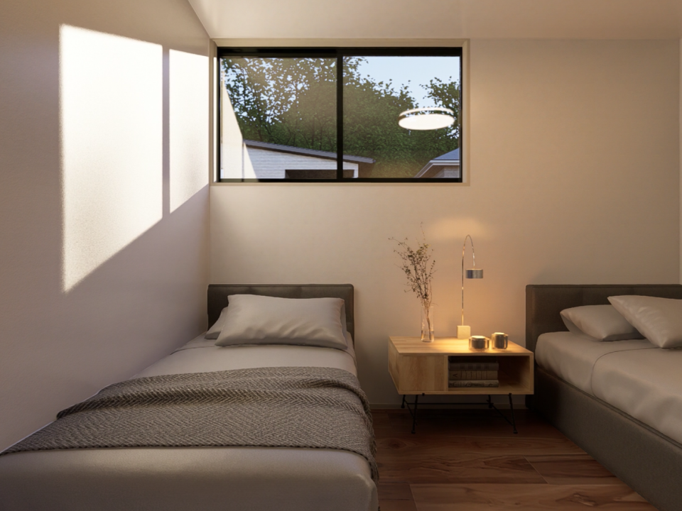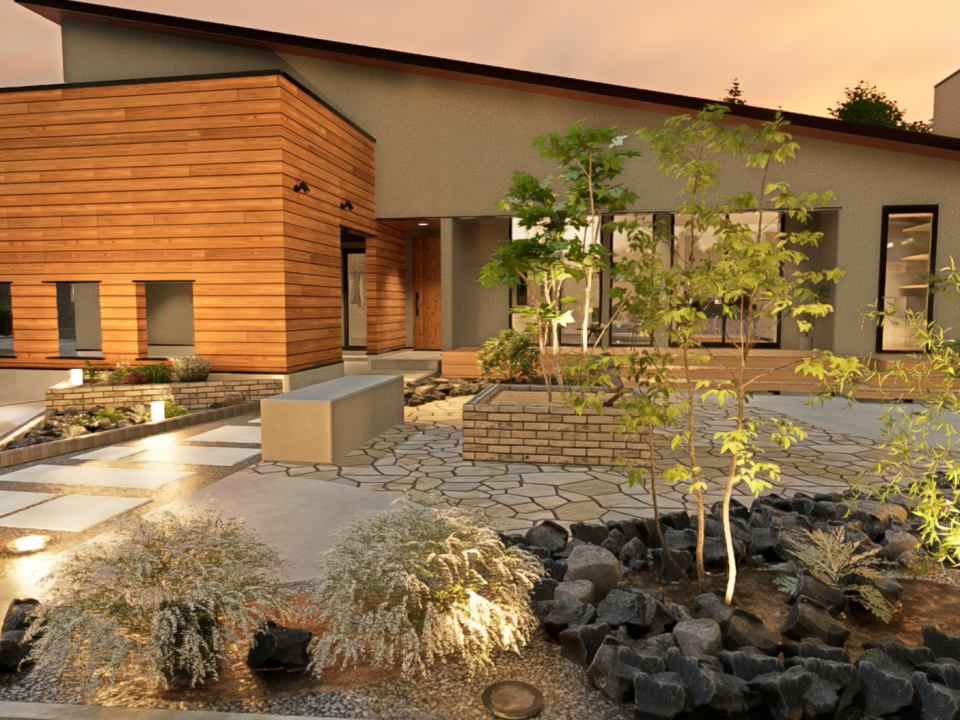 深く伸びる軒と落ち着いた外壁が、都市にありながらも平屋のような静けさを演出。周囲の環境に溶け込みながら、プライバシーを守る洗練された北欧モダンデザインです。