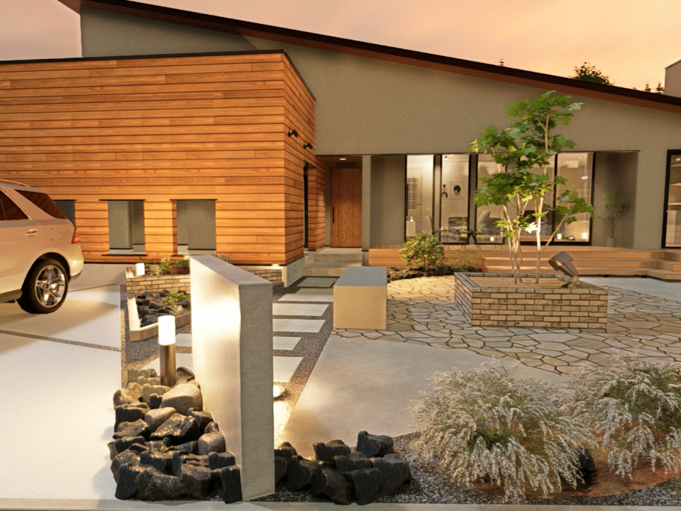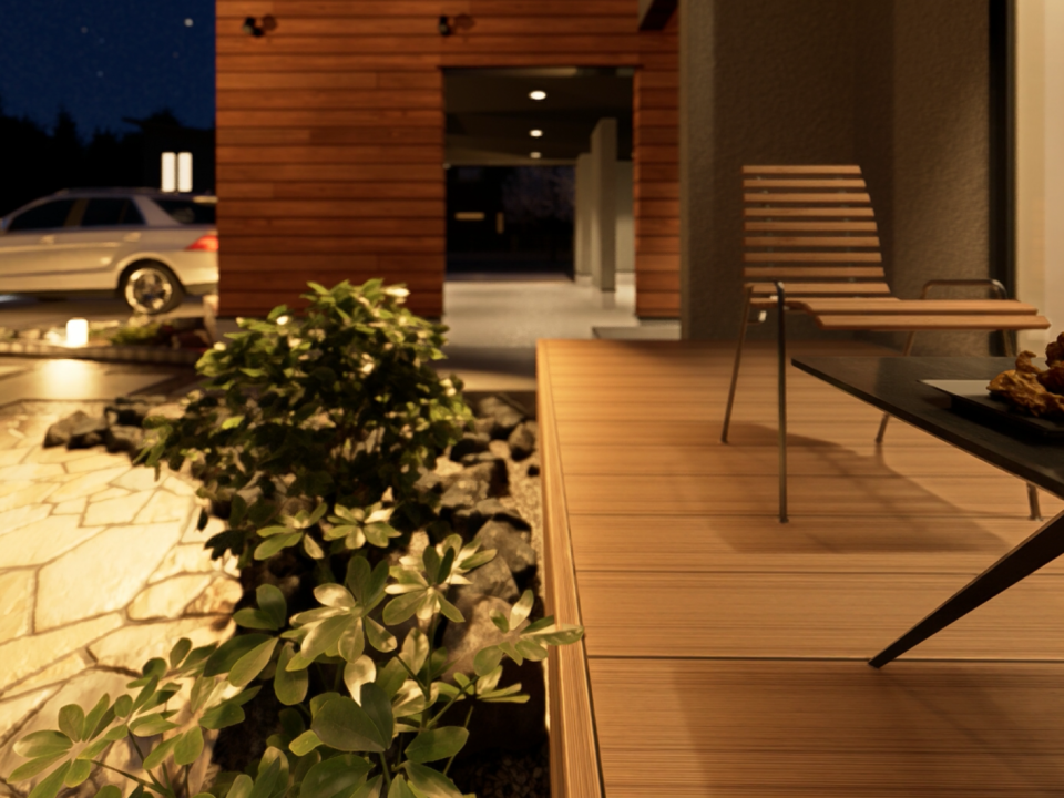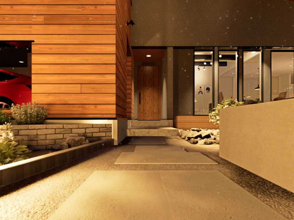 温かみのある木製ドアと外壁、そして計算された照明計画。インナーガレージとも繋がるアプローチは、訪れる人を優しく迎え入れ、帰宅した家族に安らぎを与える住まいの顔です。
