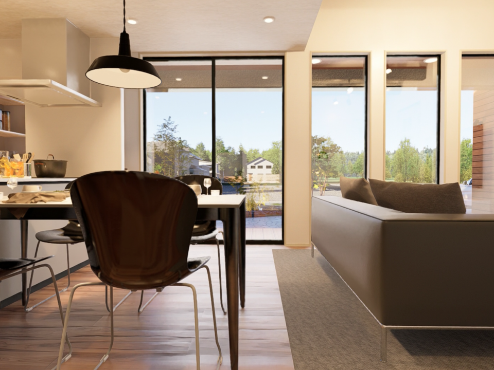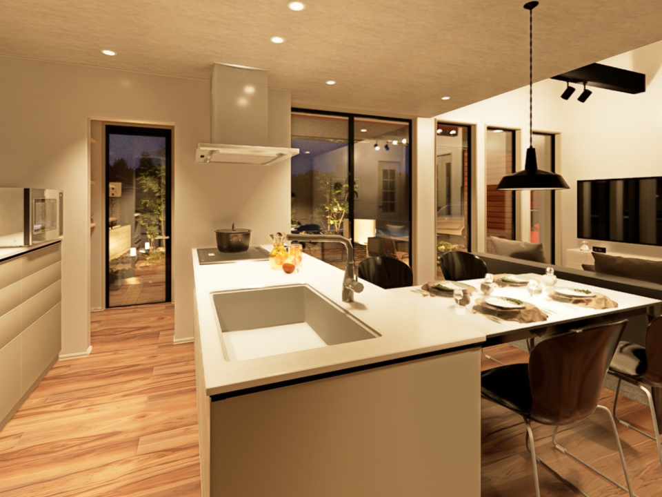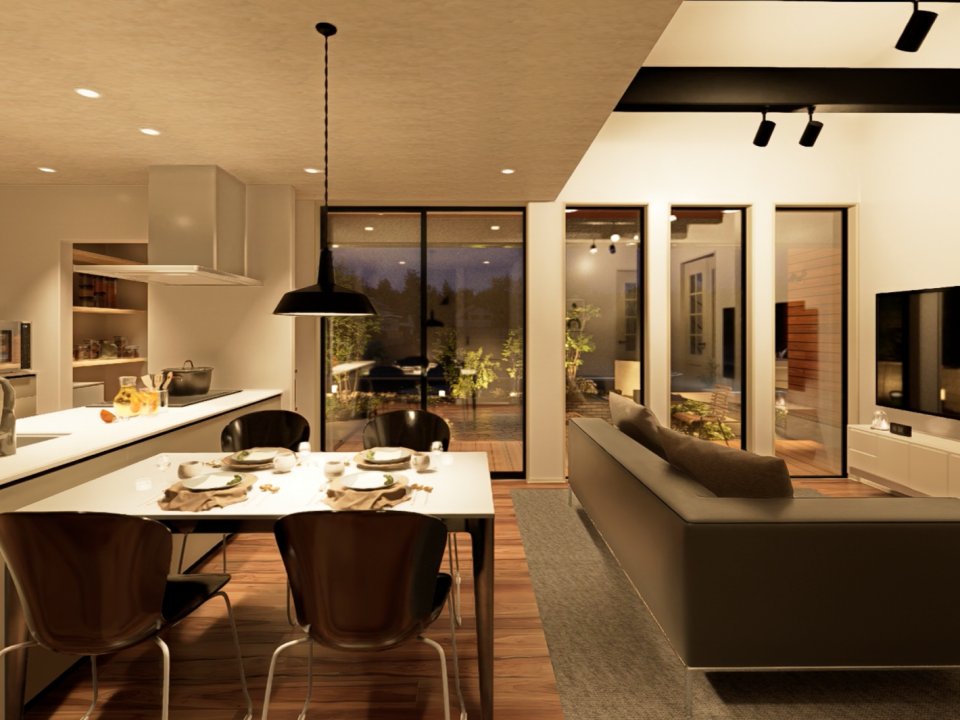 光に満ちた心地よいダイニング庭に面した大きな窓とウッドデッキが、ダイニングに明るい光と自然の景色を取り込みます。家族や友人と食事を愉しみながら、四季の移ろいを身近に感じられる心地よい空間です。